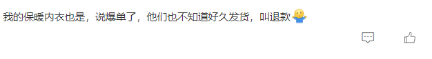 还有消费者称在薇娅直播间买的羽绒服,销售时显示12月1日发货,11月17日购买链接消失。评论区有网友回复称,买的保暖内衣爆单,无法确定发货时间,希望消费者退款。