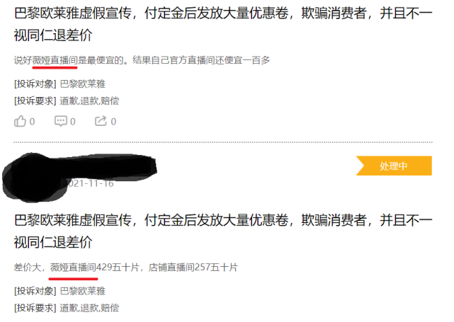事件另一关联方——薇娅直播间,近期被多位消费者在黑猫投诉平台上投诉所售欧莱雅产品价格过高,涉嫌虚假宣传。