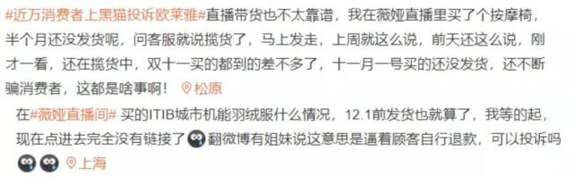 近期,同样有消费者在微博上发文称,其在薇娅直播间买的按摩椅,半个月未发货。每次询问客服,都收到“正在揽货”的回复,无法得知确切答案。