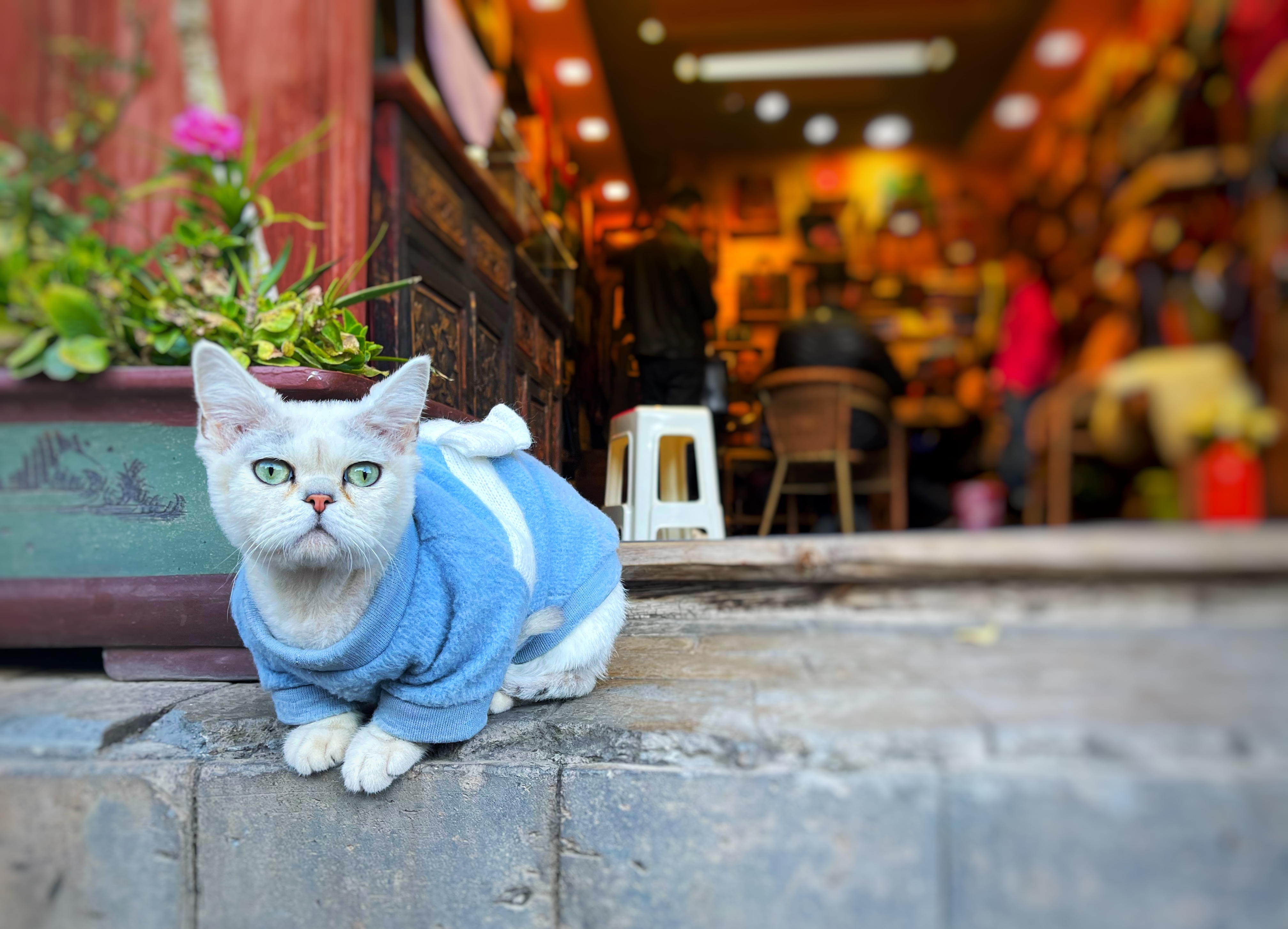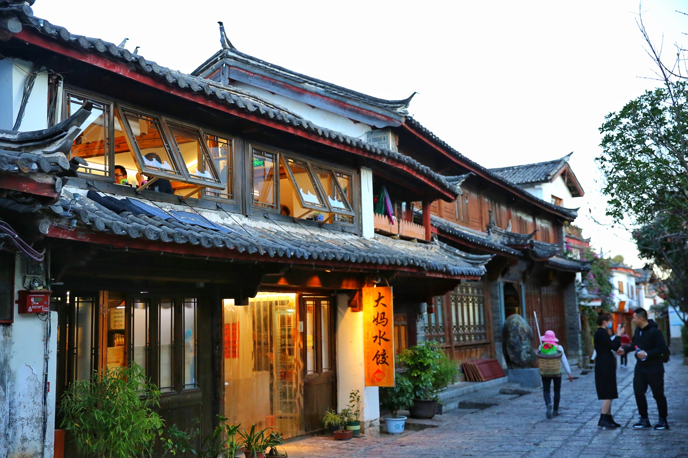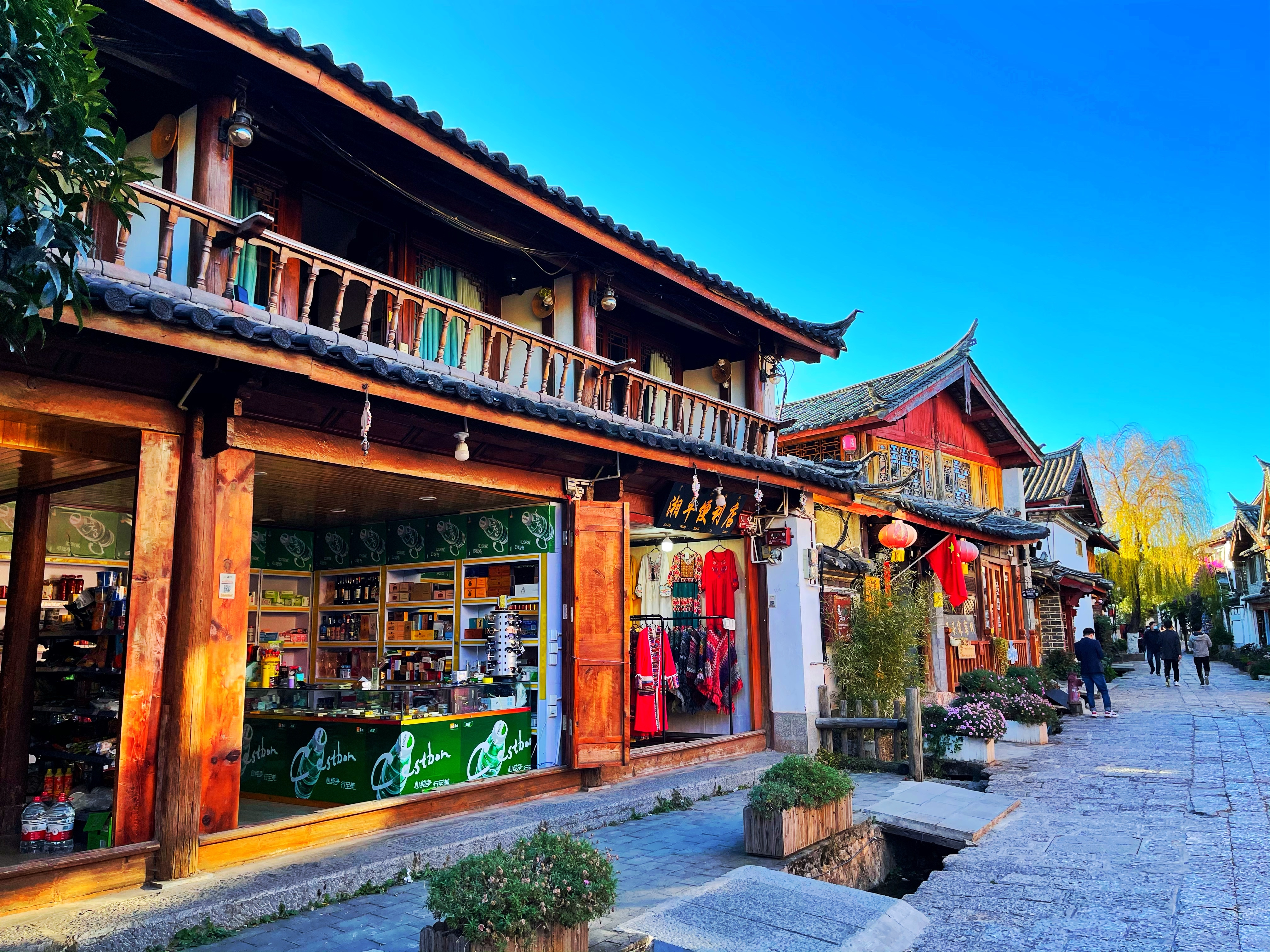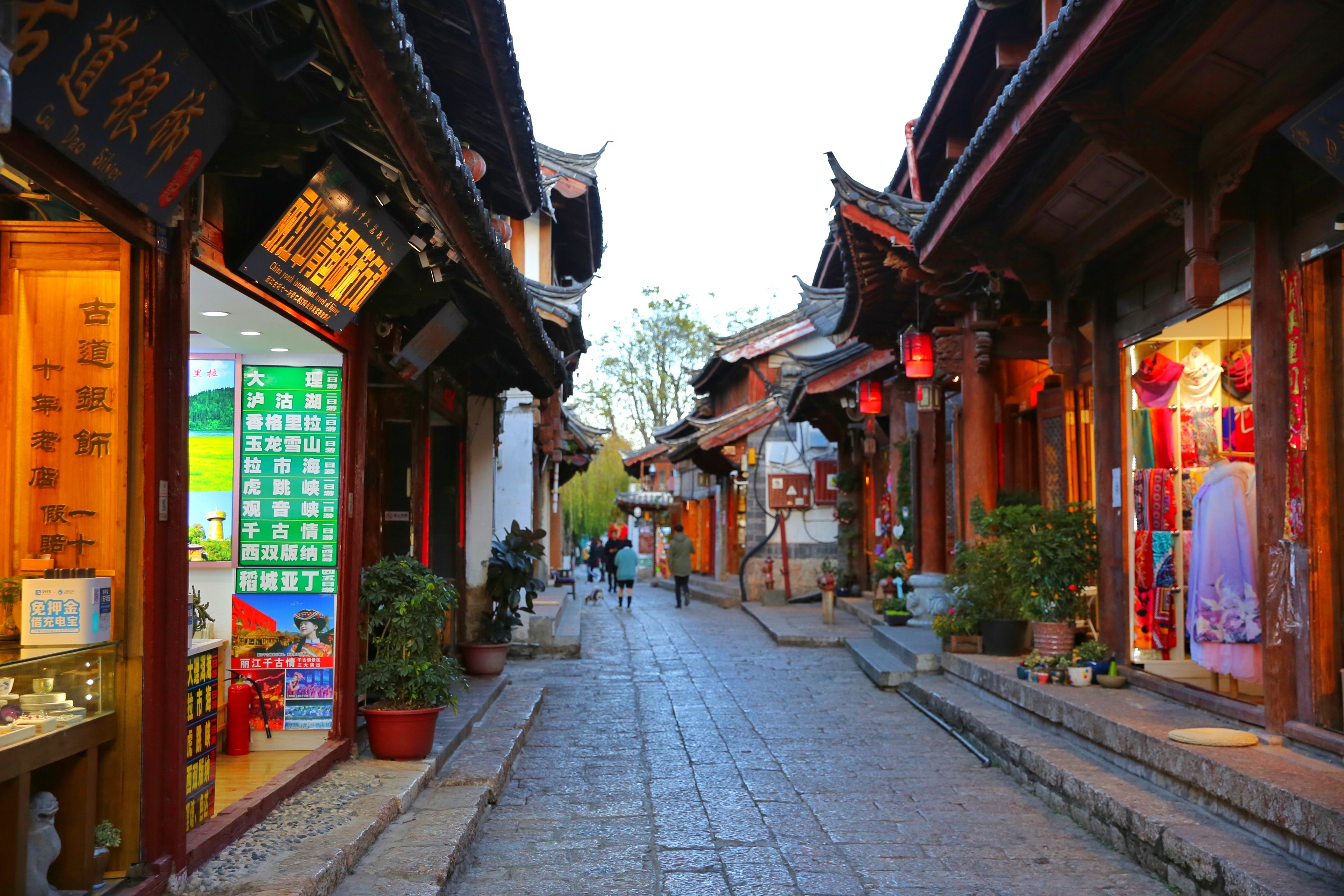 夕阳西下,只见一道道绚烂的晚霞映照,让古城披上了金色的彩缎,更增添了几分神秘的魅力。一排排依山而建鳞次栉比的商铺紧紧相依,琳琅满目的当地特产令人眼花缭乱,目不暇接。各种各样纳西族的手工艺制品、特色的小吃店铺,混合着新中外文化潮流的咖啡店门前总能聚集着人群,生意兴隆。