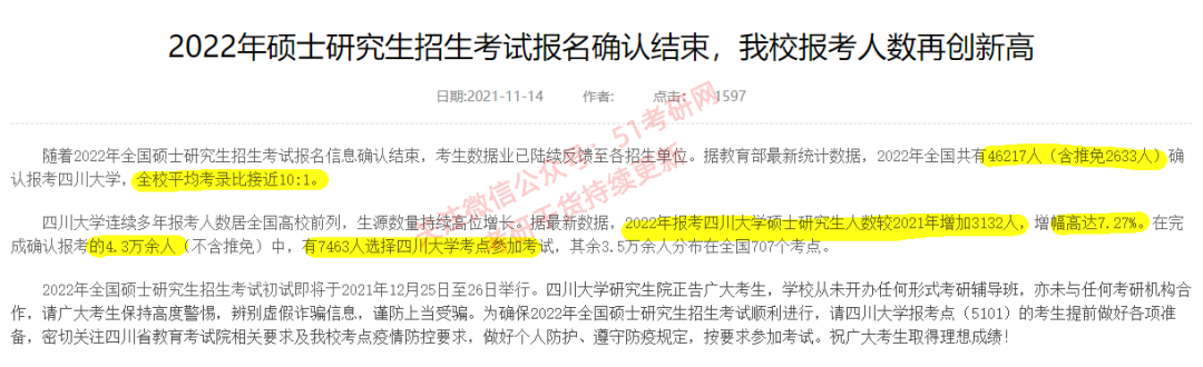 上次同学留言问四川大学的报名情况,往年川大报名人数全国第一,22考研也不例外!