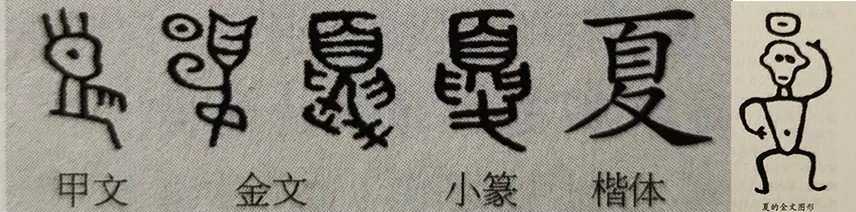 “夏”的古音读作hà,与上下的“下”同音。当西周民族沿着黄河向东扩张之时,黄河下游分封的王国所在地便称之为“夏”。也许由于越往东南气候越热。所以“夏”朝之夏与夏天之夏同源同形。汉族自称“华夏”,乃源于西周夏代的姬姜封国,汉以后,中国人称汉人。夏天的夏,与表示华夏的“夏”字字形同一,本非造字的初意。