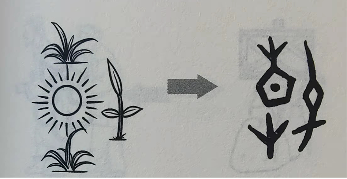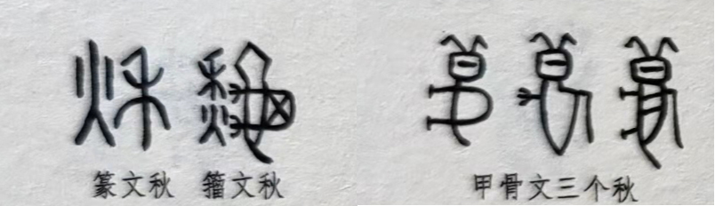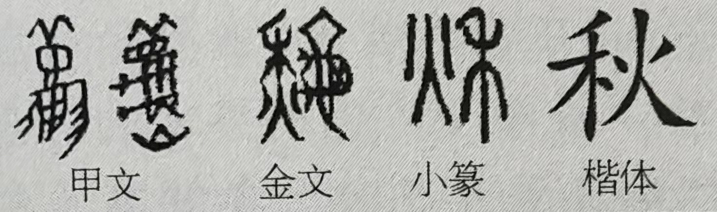 尽管,秋字的起点是相互撕咬,胜者得意鸣叫,败者溃逃不已的蟋蟀。但是,归根结底,与“秋”这一时节概念发生牢固联系的乃是农作物成熟收获时的景观。在金文中,古人在禾下增一“火”字,表示秋天禾谷枯黄。由于此字笔画太过繁杂,小篆只用了古文原字的一半,简省为“烁”。《说文解字》:“秋,禾谷熟也。”《野客丛谈》曰:“物熟谓之秋,取秋敛之义。”从火,因为古人以大火(天蝎座阿尔发星)天黑后出现于正南天作为秋季之始。楷体在隶化过程中,将左右颠倒,成为现代汉语中的“秋”。