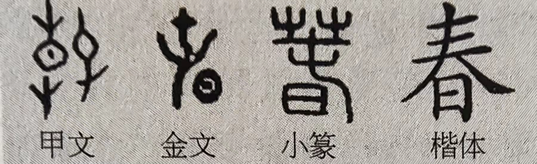金文和小篆的“春”与甲骨文比较,字形趋向匀整,上部是草字头,中间是“屯”字,下部是目标字根“日”。后来,经过隶书的变化,“春”字才演变成现今的字体,“草”字和“屯”字都已经看不出来了。但是,“春”指一年的开始,这一本义却一直未变。如春天的景色称为“春色”、“春光”,春季农事繁忙称为“春忙”,在大年三十,用红纸书写吉祥词句的对联称为“春联”等等。古代文学家有许多描写草木生长的名句,如“春到江南花自开”、“春到人间草先知”、“春到人间万物鲜”等,这些诗句,形象地表现了春天万物萌生这一物候现象。