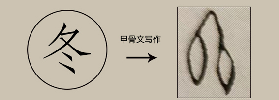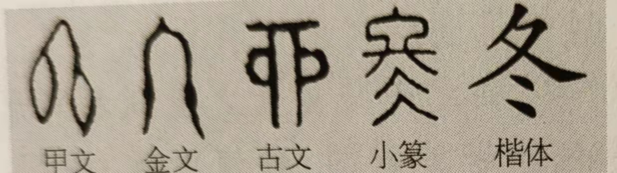 上古先民在万物萧条的景象中,获得“冬”的季节概念一定很早,因为这一时期伴随的是寒冷和饥饿,这种感受实在深刻尖锐。然而,用明确的文字来表达这一季节,则是稍后的事情了。《三体石经》中的古字符号,在“冬”字甲骨文符号这种表示胎儿和胎盘相联结的图形里增加“日”字,则表明“冬”已演化为一种独立、纯粹的时间概念。小篆去日但在下面增添了一个古文的“冰”的符号,楷书缘此写作“冬”。当“冬”被加上“系”字旁时,这就表达了一年的终结或结束。