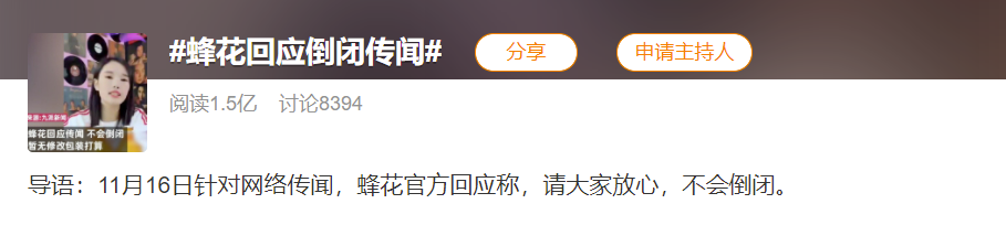 11月16日,蜂花在淘宝直播间回应称,“请大家放心,不会倒闭,卖的便宜是因为产品定位是大众消费。”主播还表示,蜂花10年仅涨2元,未来也不会因为火了就涨价。很快,#蜂花回应倒闭传闻#话题在全网蔓延。截至目前,微博话题已有1.5亿阅读量。