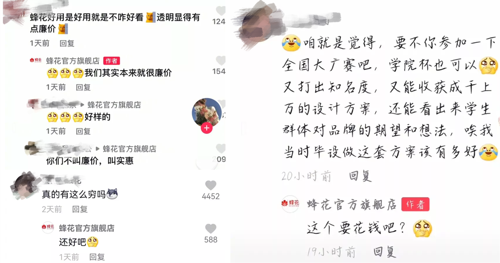有网友出主意,参加活动来打出知名度,蜂花回复,“这个要花钱吧?”有网友说包装不好看显得廉价,蜂花说,“我们其实本来就很廉价。”有热心网友帮忙设计包装,蜂花回复,“大家放心,换新包装也不会涨价。”