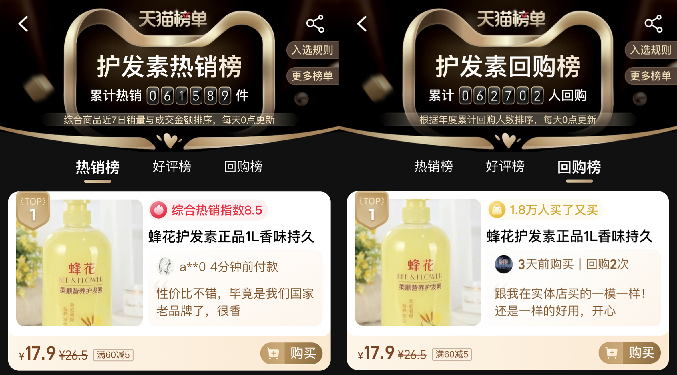 国货品牌在互联网翻红,存在一定偶发性,但借势天猫等电商平台焕发新生,却给它们带来稳定爆发。今年双11,220家老字号品牌在天猫双11销售额同比增长超100%,充分印证了“老字号是最成功的新品牌”。在天猫榜单中,蜂花护发素则持续霸榜护发素热销榜和回购榜TOP1。