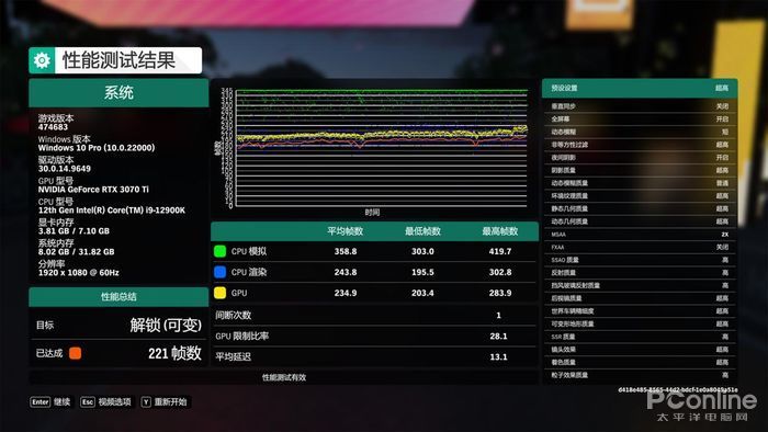 而在《极限竞速:地平线4》内置的游戏基准测试中,游戏帧率成绩为221Fps, CPU模拟的平均帧数为358.8,CPU渲染的平均帧数为243.8.,游戏平均延时为13.1。