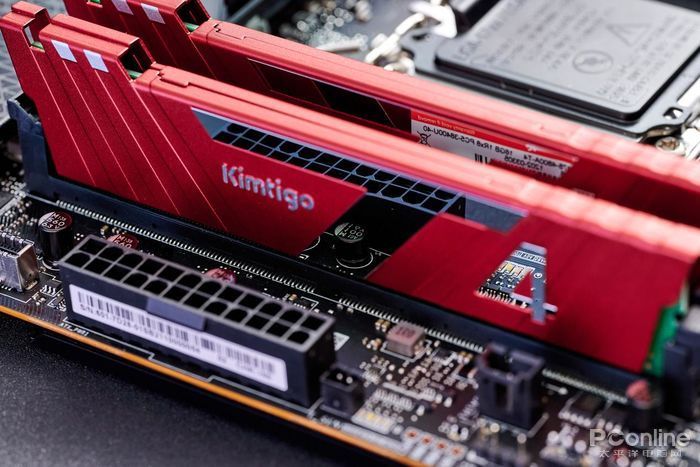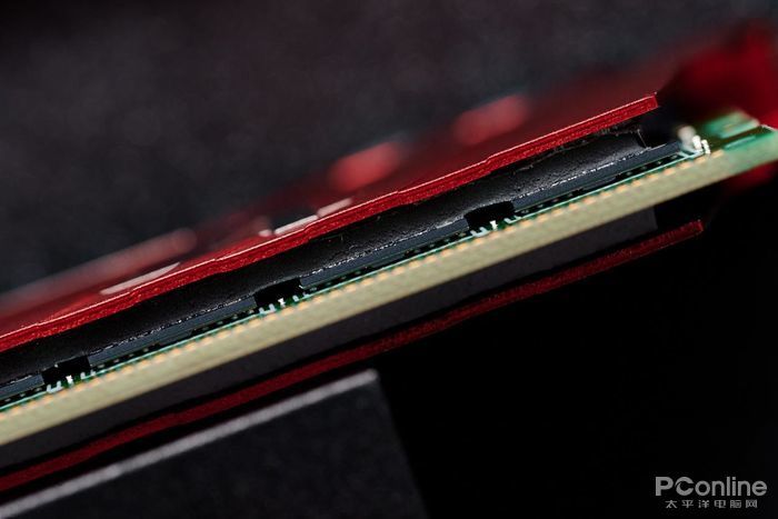 通过散热马甲与PCB基板的缝隙能看到内存芯片与散热马甲之间通过散热硅胶垫相连接,芯片工作时所产生的热量透过散热垫传导至散热马甲,能够快速的散热,确保内存稳定运行。