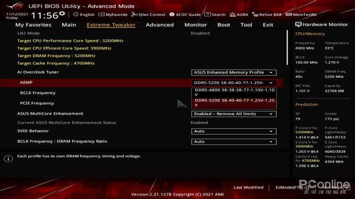 在BIOS里面内存设置选项中,提供了类似XMP的内存选择设置,这得益于华硕主板的内存增强配置文件(AEMP)固件功能,可以针对受限PMIC的内存而设计,通过AEMP会自动检测内存芯片,从而提供优化的频率、时序及电压参数设置,轻松释放性能潜力,对于超频新手这个功能相当人性化。