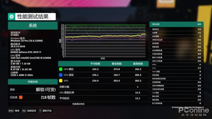 而在《极限竞速:地平线4》内置的游戏基准测试中,整个平台所测试到的游戏帧率成绩为218Fps,而其中CPU模拟的平均帧数为334.5,CPU渲染的平均帧数为236.1.游戏平均延时为13.1。