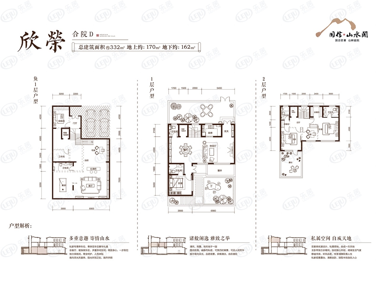 该户型总建面约332㎡,地上约170㎡,地下约162㎡,为五室四厅三卫的合院格局,南北通透,采光充足,通风效果好。