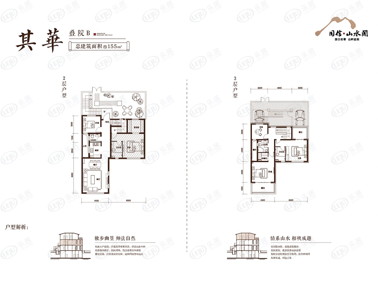 该户型建面约155㎡,为四室两厅三卫的叠院格局,带有私家入户庭院,增加了室内外的联动性,也可以做室外烧烤,增加了生活趣味性、立体空间感和开阔感,居住舒适度高。。