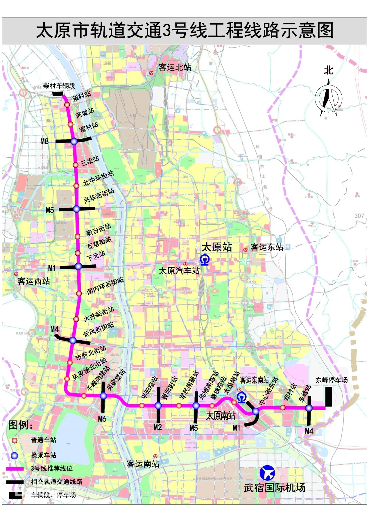 太原轨道交通3号线,为一条南北向穿越汾河西侧片区,东西向跨越汾河、联系汾河两岸片区的骨干线路。线路北起柴村,由北向南主要经过和平北路、和平南路后,向东转入南中环街、下穿汾河后进入晋阳街,经太原南站向南进入中心街,沿中心街向东抵达终点站东峰村,长约30.5公里,全部为地下线,设站25座,其中换乘站9座。在下元站、中心街东站与一号线实现换乘,在晋阳街站与二号线实现换乘。