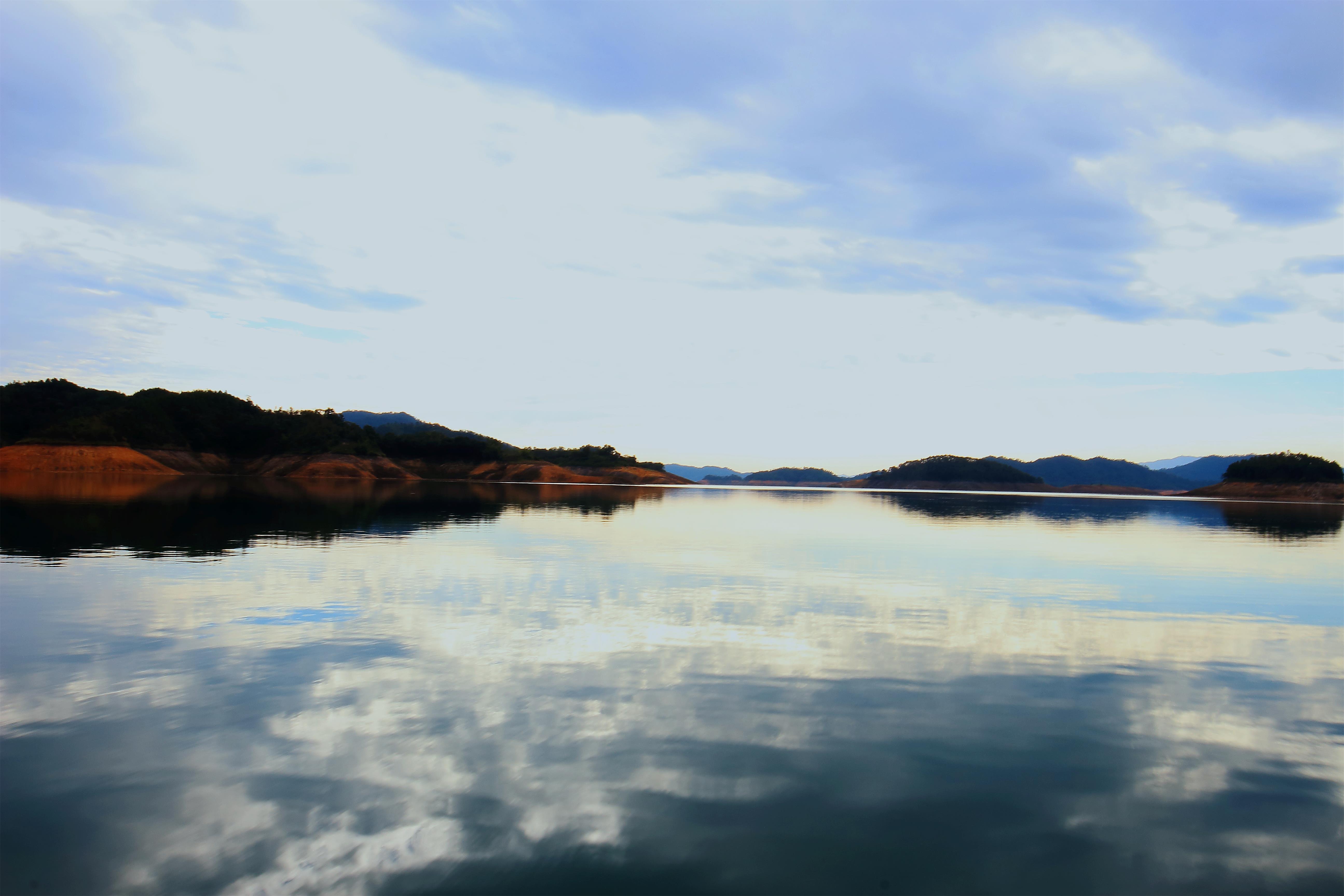 6.30到9.00点,围绕锡场镇万绿湖畔来回地走了10公里,9.00点乘船离开。今天运气不错,短暂无风,湖面镜子般清澈、明晰地照映出灰、白、蓝,还有泛微黄的色彩。