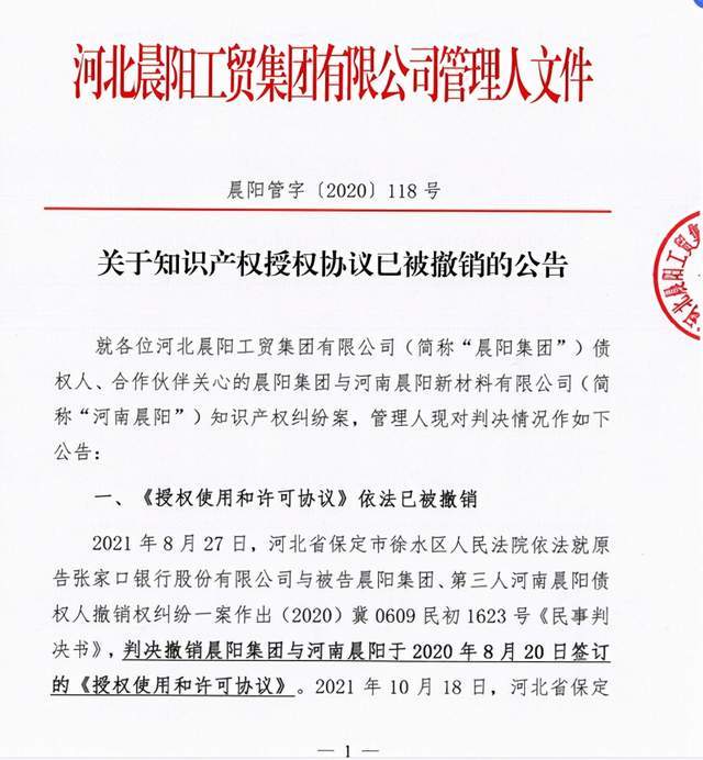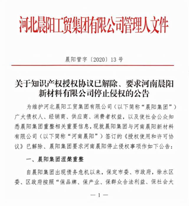 2021年1月20日,晨阳集团管理人发布《关于知识产权授权协议已解除、要求河南晨阳新材料有限公司停止侵权的公告》称,就晨阳集团与河南晨阳签订的《授权使用和许可协议》已解除、晨阳集团要求河南晨阳停止侵权。