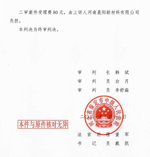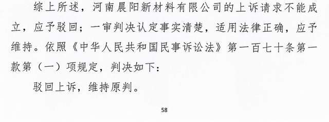 法院认为:一审判决认定事实清楚,适用法律正确,应予维持。依照《中华人民共和国民事诉讼法》第一百七十条第一 款第(一)项规定,判决如下:驳回上诉,维持原判。二审案件受理费80元,由上诉人河南晨阳新材料有限公司负担。本判决为终审判决。