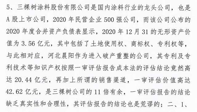 但显然,河南晨阳并不认可,认为晨阳水漆一审评估报告的结论缺乏真实性和合理性,结论是荒谬的。河南晨阳举证称三棵树涂料股份有限公司是国内涂料行业的龙头公司A股上市公司,公司公布的2020年度合并资产负债表显示,2020年12月31日的无形资产价值为 3.56亿元,其中包括了土地使用权、商标权、专利权等, 与此相对应,河北晨阳作为进入破产重整的公司,其专利及专利技术等知识产权按照一审评估报告成本法的评估结论竟然高达20.44亿元 ,加上所谓的销售渠道 ,一审评估价值高达 62亿元,是三棵树公司的11倍有余。