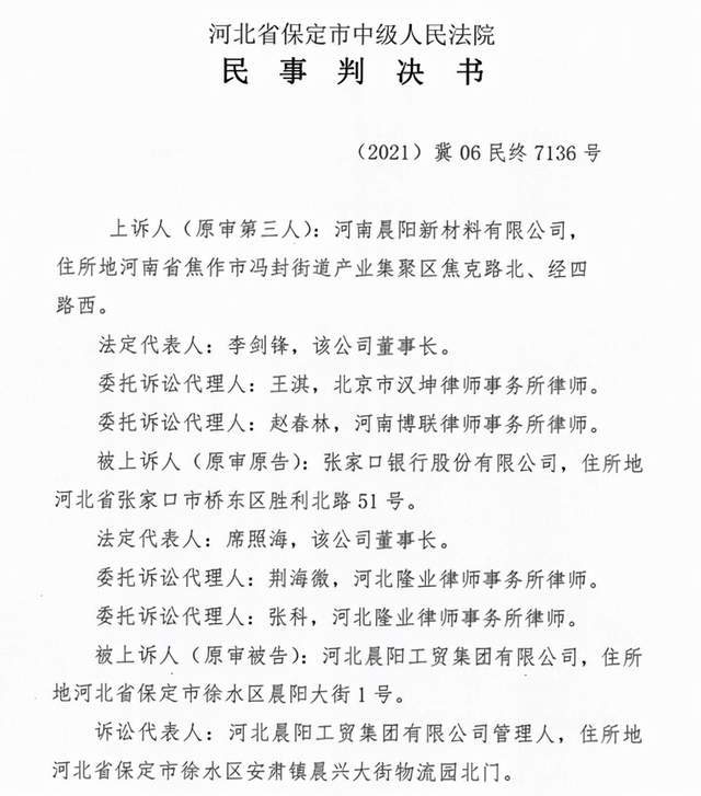 2020年11月30日,焦作市中站区人民法院经审查,裁定驳回了河南晨阳、河南汉莎的起诉。裁定书对原告河南晨阳、河南汉莎起诉的事实和理由记载如下:原告河南汉莎系龙蟒佰利联集团股份有限公司(以下简称龙佰集团)的关联公司。截至2019年12月,河北晨阳累计拖欠龙佰集团货款约8000万元;其后,河北晨阳董事长刘善江又以补充流动资金为由,隐瞒河北晨阳资不抵债的基本事实,请求龙佰集团协调下属焦作市创基高端智能产业园有限公司为河北晨阳提供3500万元的短期借款。