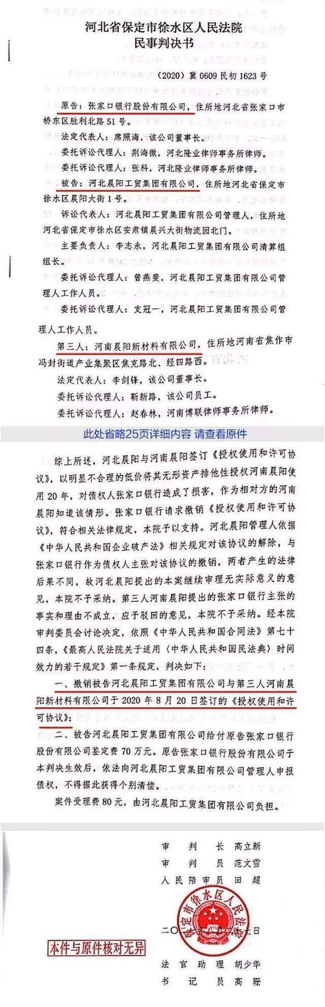 张家口银行是河北晨阳的最大债权人之一。2019年4月至2020年9 月,河北晨阳及其关联公司向张家口银行借款18笔,金额136970万元。双方签订的借款合同第七条约定:借款人在书面通知张家口银行且清偿本合同项下借款本息或向张家口银行提供其认可的还款方案及担保前,不得出售、赠与、出租、出借、转移、抵押、质押或以其他方式处分重要资产。