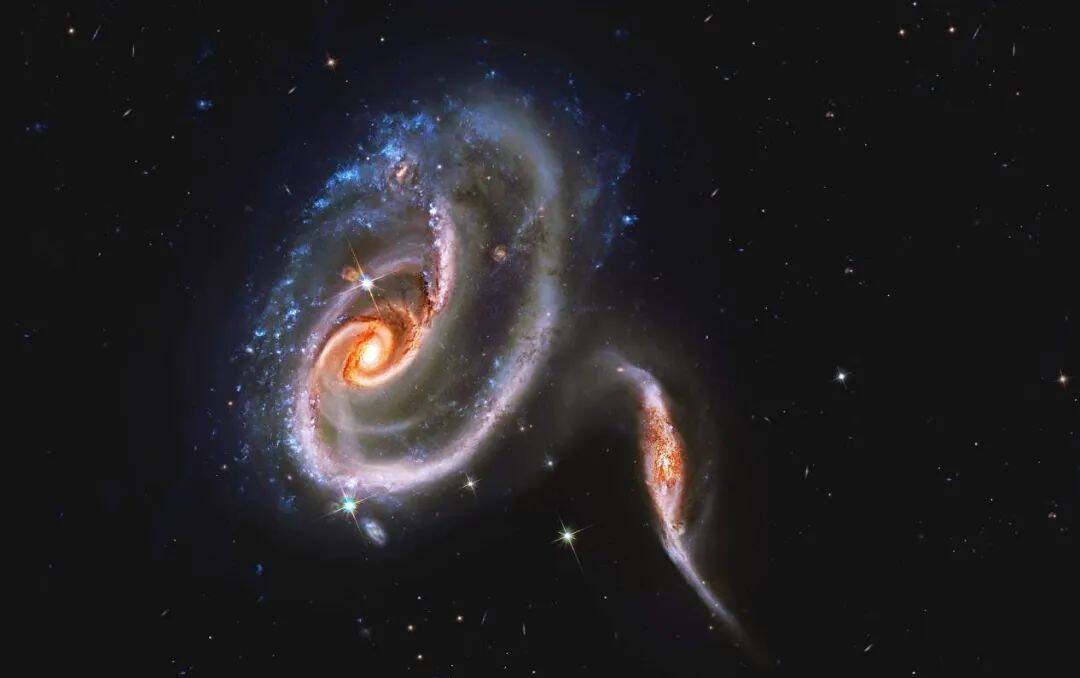 霍格天体是一个罕见的环形星系,约为10万光年(略高于银河轨道),距离地球约6亿光年。哈勃太空望远镜不断有新的发现。这张照片由其拍摄,并由地球物理学家贝努特·布兰科处理。我们可以看到数十亿颗闪耀的蓝色星球形成了一个完美的环,这个环围绕着一个更小、更密集的黄色星球形成的星系,这些黄色星球更古老。在这两个环状星系之间,我们可以观察到另一个环状星系,它离我们更远。