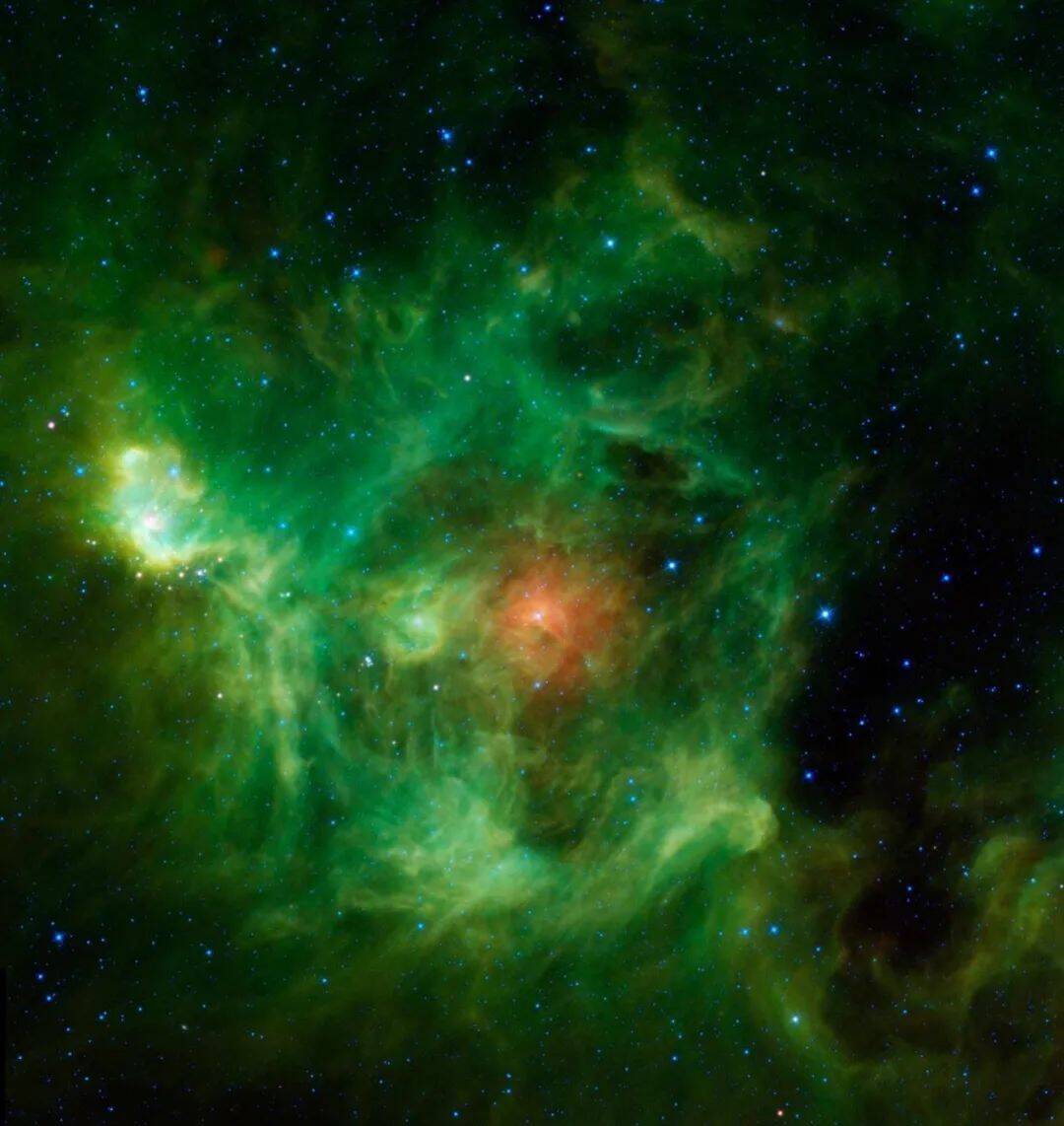 图解:巴纳德3号(IRAS环G159.6-18.5),它充满了明亮的绿色和红色的尘埃云。绿色环是由微小的暖尘颗粒构成的,其成分与地球上发现的烟雾非常相似。中心的红色云很可能是由比周边地区更凉爽的灰尘构成的。图源:nasa