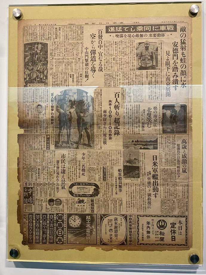博物馆馆长吴先斌告诉记者,这张报纸是他两年前从日本朋友那里辗转得到的。“百人斩”的照片此前多有流传,但报道“百人斩”的日本报纸原件不多见。这份报纸展出后,一位藏界朋友告诉他,自己也有一份刊登“百人斩”报道的《东京日日新闻》原件,出版于当年12月14日,“连续报道、鼓吹惨无人道的‘百人斩’,一定程度上体现出当时日本国内的战争狂热。”
