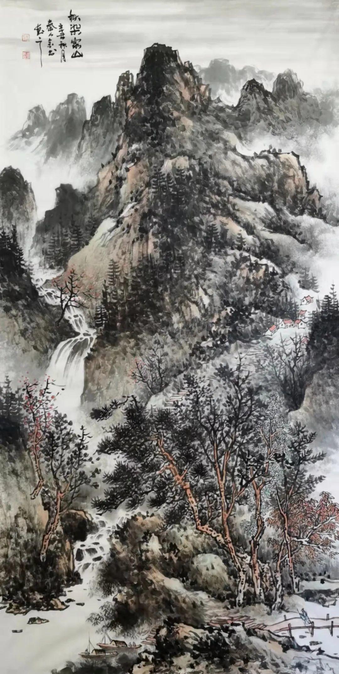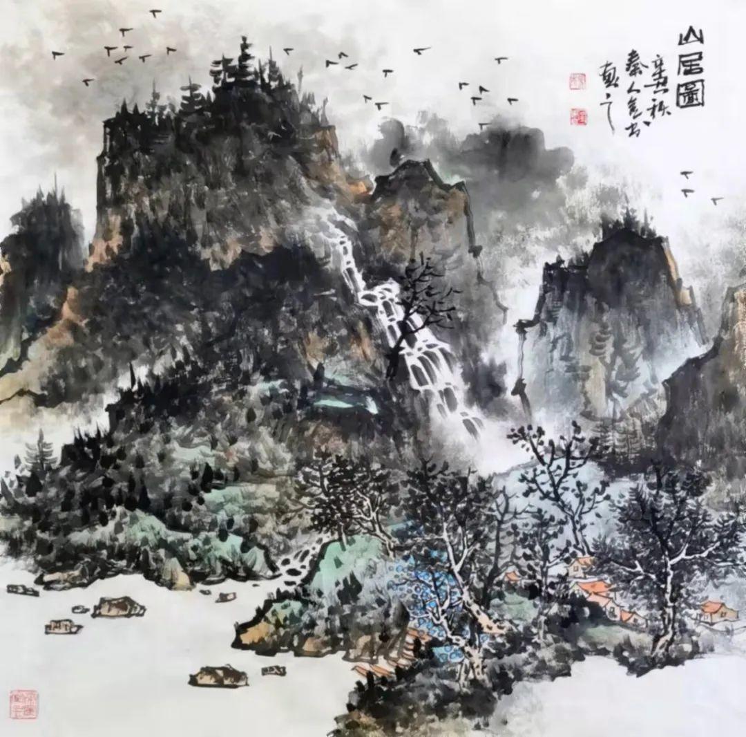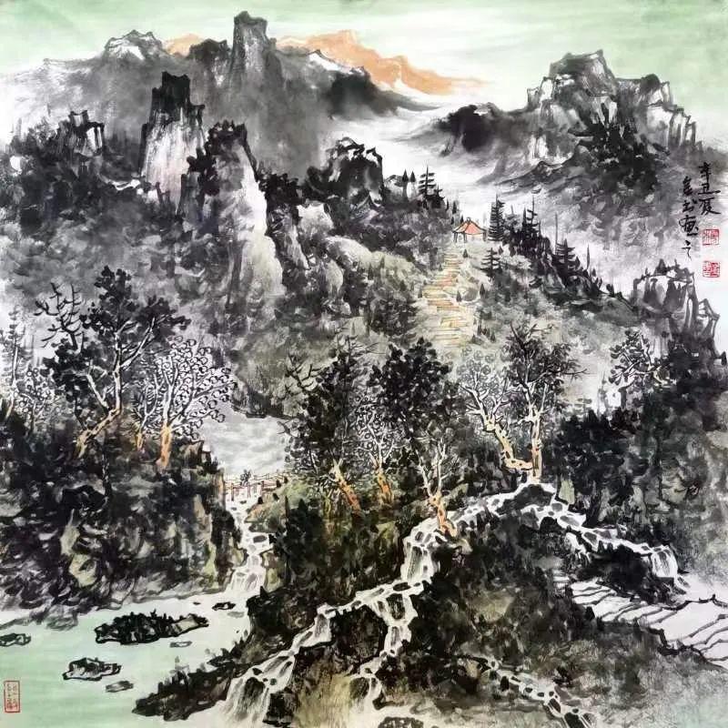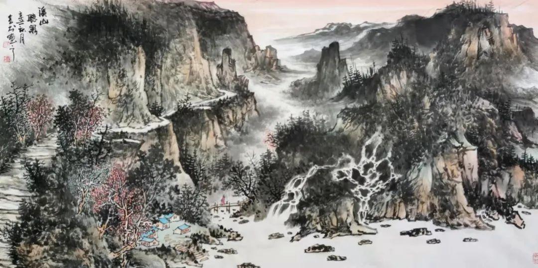 杨金书先生在山水画作品中,将其强烈的抒情特征赋予山水,追求画作“山外之山,象外之象”的艺术境界。用墨下笔中以师法自然而出神韵,于崇山峻岭间,于苍岭烟云之内,揉入了他的艺术思想,寄情于苍茫大地,钟情于山麓巍峨。