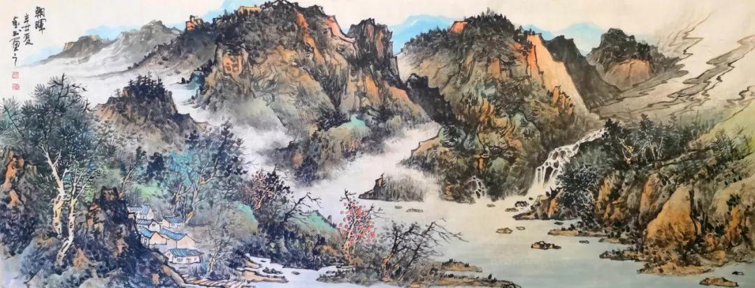 杨金书先生创作的这幅《朝晖》,在设色用度方面颇为精巧,作品中既有对物像的直观感受,又有画面内涵派生出的气象、画面空间感。画作中水汽氤氲处冷淡清雅,而遇朝晖欲出一片生机暖意。山石之中皴擦出沟壑嶙峋的质感,加上浓墨干笔淡彩共同造就了一幅充满活力的意象。
