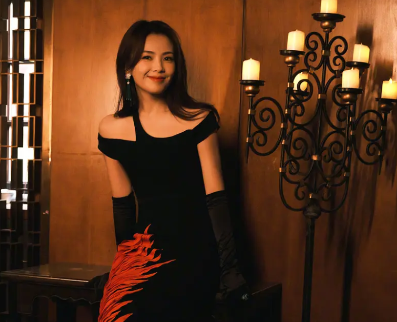另一身黑色抹胸长裙,开叉直到大腿高处,露出白皙薄背,大波浪发型加烈焰红唇,好身材尽显,宛如撩倒众生的港风千金。
