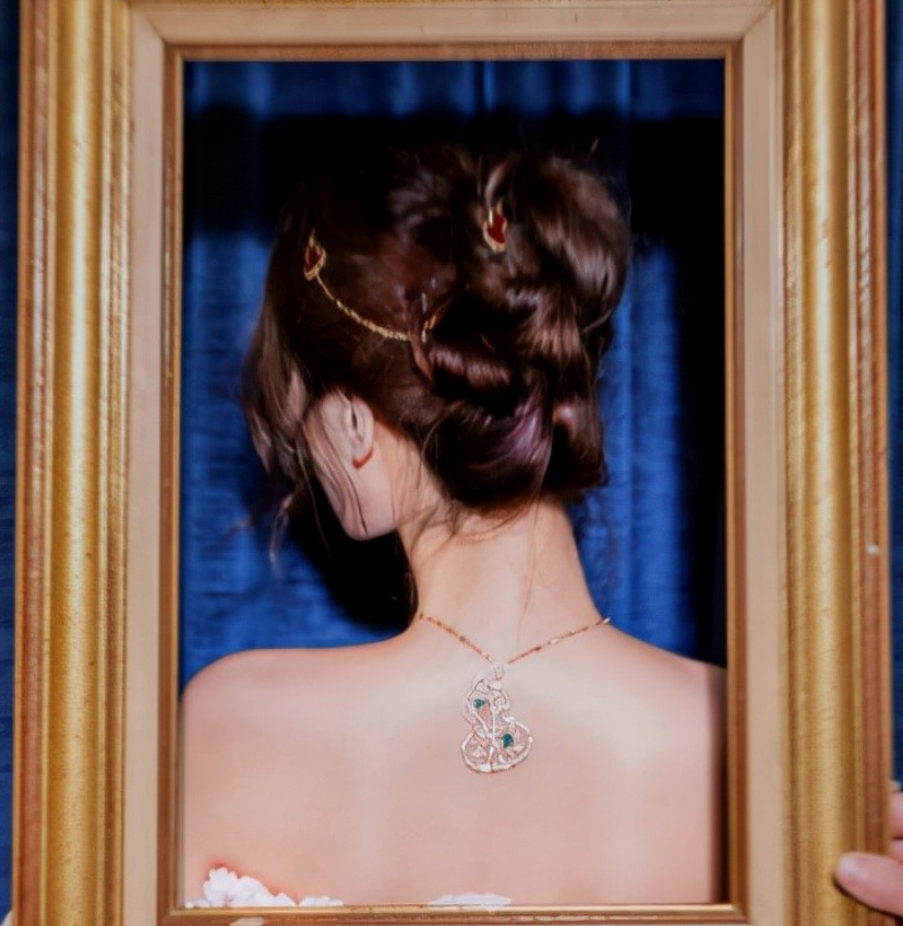被凸显出来的天鹅颈更是绝绝子,竹子花纹的项链当成头饰更是神来之笔,真是妥妥的画中走出来的“东方美人”。