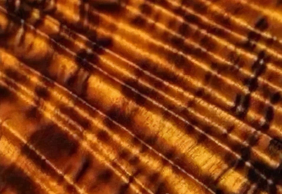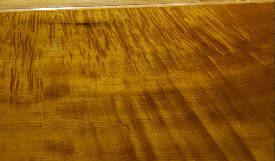 纹理成细丝状,条条金线,清晰流畅,木材表面在阳光下金光闪闪,金丝浮现,细腻均匀,非常平和高贵。还有颜色泛绿的名为绿金丝。