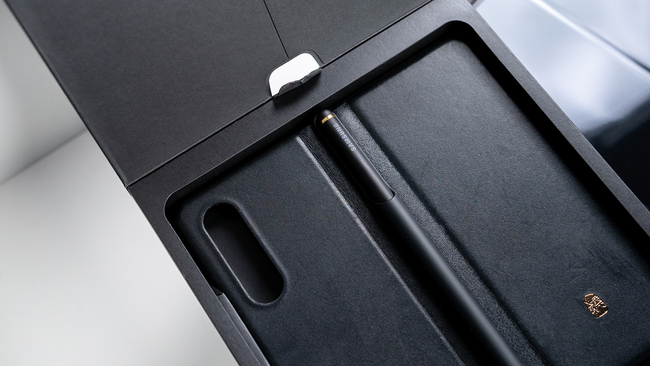 从包装到手机采用了黑金色调,黑色包装盒正中间是醒目的金色“心系天下”标识,很有尊贵感。礼盒式两侧打开后里面包含了手机、真皮保护套、专属S Pen、备用S Pen笔尖等配件。
