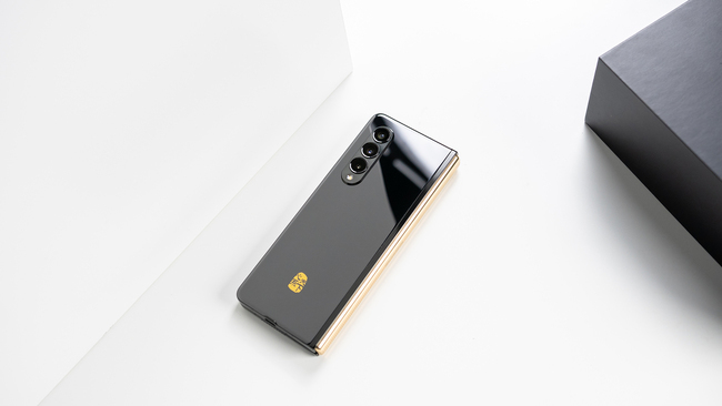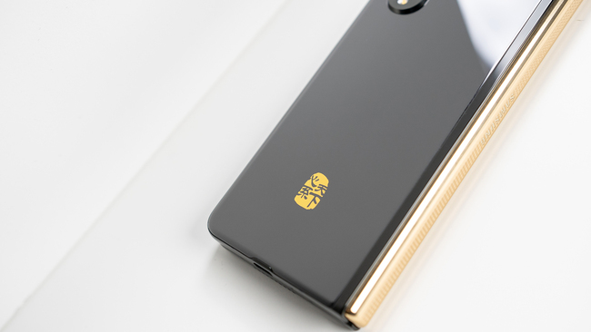 回到三星W22 5G本体,手机主体为黑色,很商务,同时背部下方印有金色的“心系天下”标识,同时整个铰链外部做了大面积的金色处理,而且采用高端腕表的PCD金属精密切割工艺和纳米级抛光研磨雕琢,整体奢华感营造的相当到位。