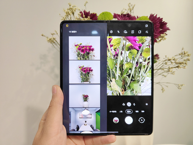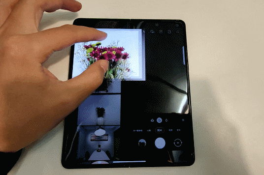 作为折叠屏,在展开状态下拍照时,三星W22 5G加入了预览功能,右侧屏幕为相机界面进行拍摄,左侧为预览界面,右侧拍摄的照片会实时显示在左侧,这样在拍摄完成后无需再进入相册查看,直接就能在左侧查看,而且和在相册想看照片一样,双指捏合可以放大缩小,长按还可以进行分享与删除,效率UP!