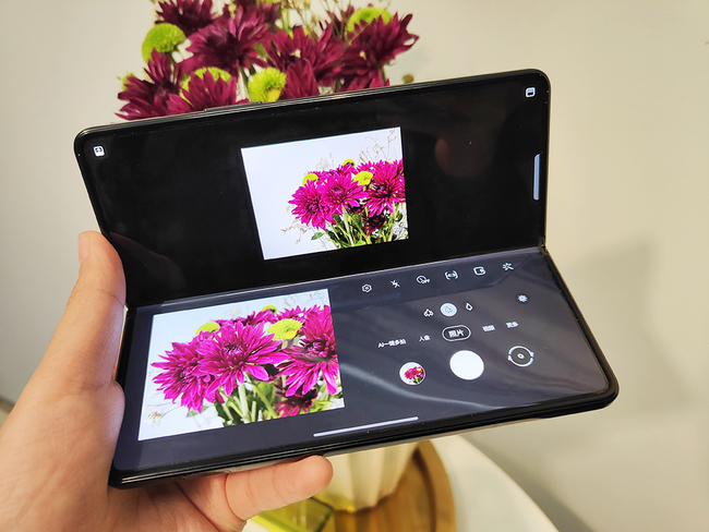 或者半折叠状态下,一半屏幕用来拍摄,另一半用来查看成像;另外展开状态下,内屏拍照外屏同时用作取景框进行预览,对于拍摄人像时被拍摄人物能够实时查看自己的实际成像效果,进而可以对拍摄者进行指导调节,可玩性非常高。