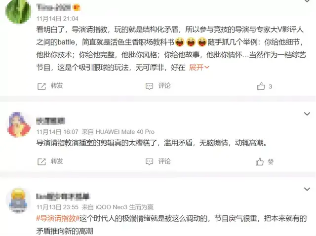 作为拥有《演员请就位》制作经验的节目组,深谙话题综艺的炮制方法,如出一辙般创作出的《导演请指教》也同前作一样,因不专业与对创作的不敬畏,并不被观众和行业认可。掌握了流量密码的节目组,通过挖掘、释放不同群体之间的矛盾,频繁创造话题冲击热搜榜单。