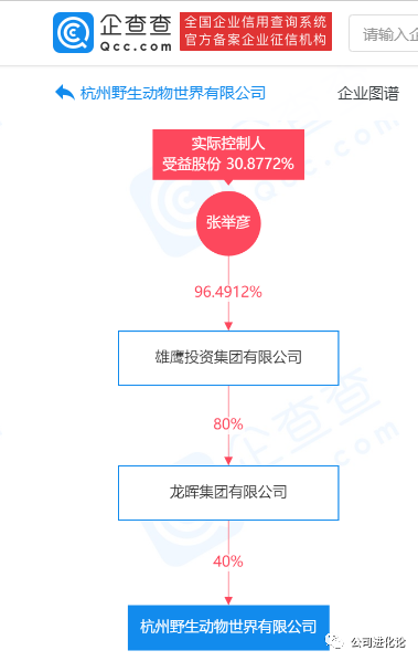 记者自企查查APP获悉,杭州野生动物世界有限公司的法定代表人为张德全,注册资本为5000万元,第一大股东为龙晖集团有限公司,持股比例为40%,张德全本人直接持有杭州野生动物世界有限公司8%的股份。