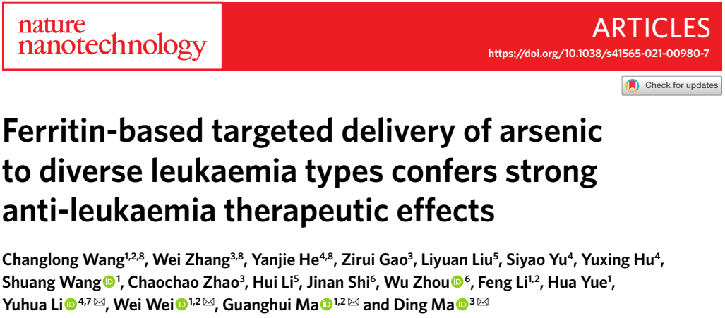 10 月 25 日,相关论文以《基于铁蛋白靶向递送砷至多种类型白血病细胞并显著增强白血病治疗效果》(Ferritin-based targeted delivery of arsenic to diverse leukaemia types confers strong anti-leukaemia therapeutic effects)为题发表在 Nature Nanotechnology 上[1]。