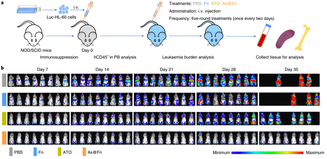 图|HL-60(AML)移植异种移植模型中的抗白血病疗效(来源:Nature Nanotechnology)