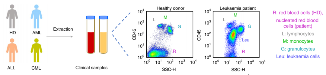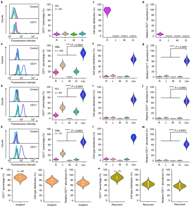 为了探究白血病细胞是否具有 CD71 高表达性,该团队筛选了健康人体外周血样本和白血病患者骨髓样本中细胞的 CD71 表达水平。