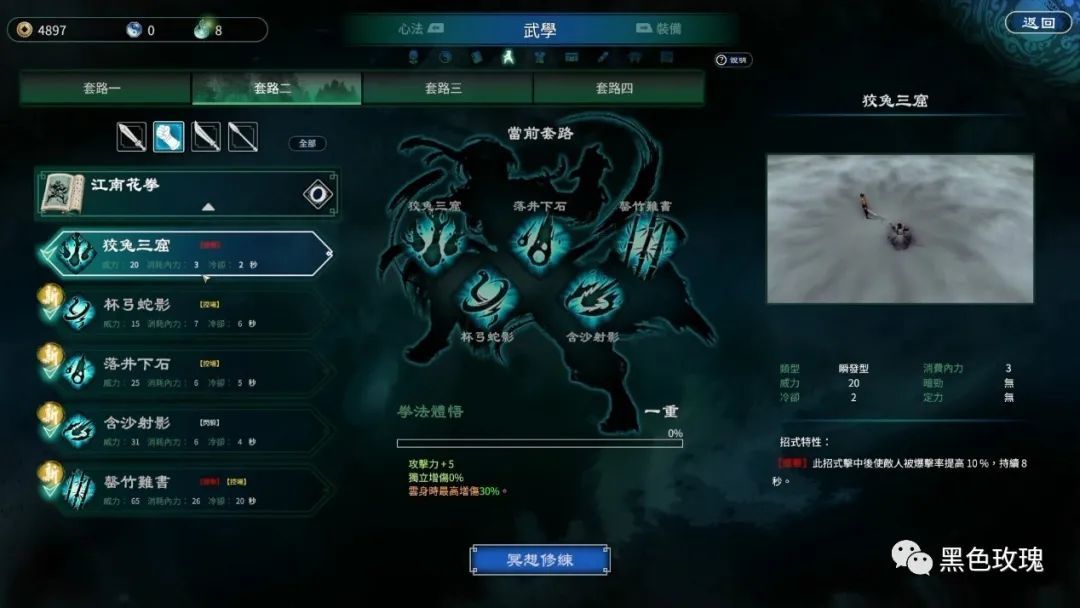 武功与心法,则依然是本作里武侠气息最浓厚的系统。武学招式分为刀枪剑拳四类,可以被自由搭配在四个套路栏中,在战斗中随时切换。玩家的战斗风格也因此而可以十分多变,一会儿用剑以气伤敌,一会儿则耍刀大开大合。修炼心法可以不断提升玩家的基础属性,也能在战斗中充当出招时的“功体”,为玩家带来回血、回魔等多种特色鲜明的BUFF。