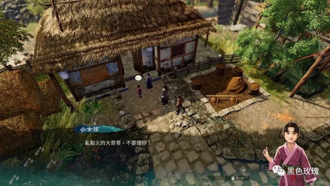许多时候,这些互动还能够产生意想不到的效果。如果在白墙上“破坏”,主角就会顺手写下“到此一游”的留言;对着堆放的药材“运劲”,会震落一条大蜈蚣下来;“点燃”捆好的稻草,一旁的NPC会目睹到主角的恶行,拒绝与主角对话……