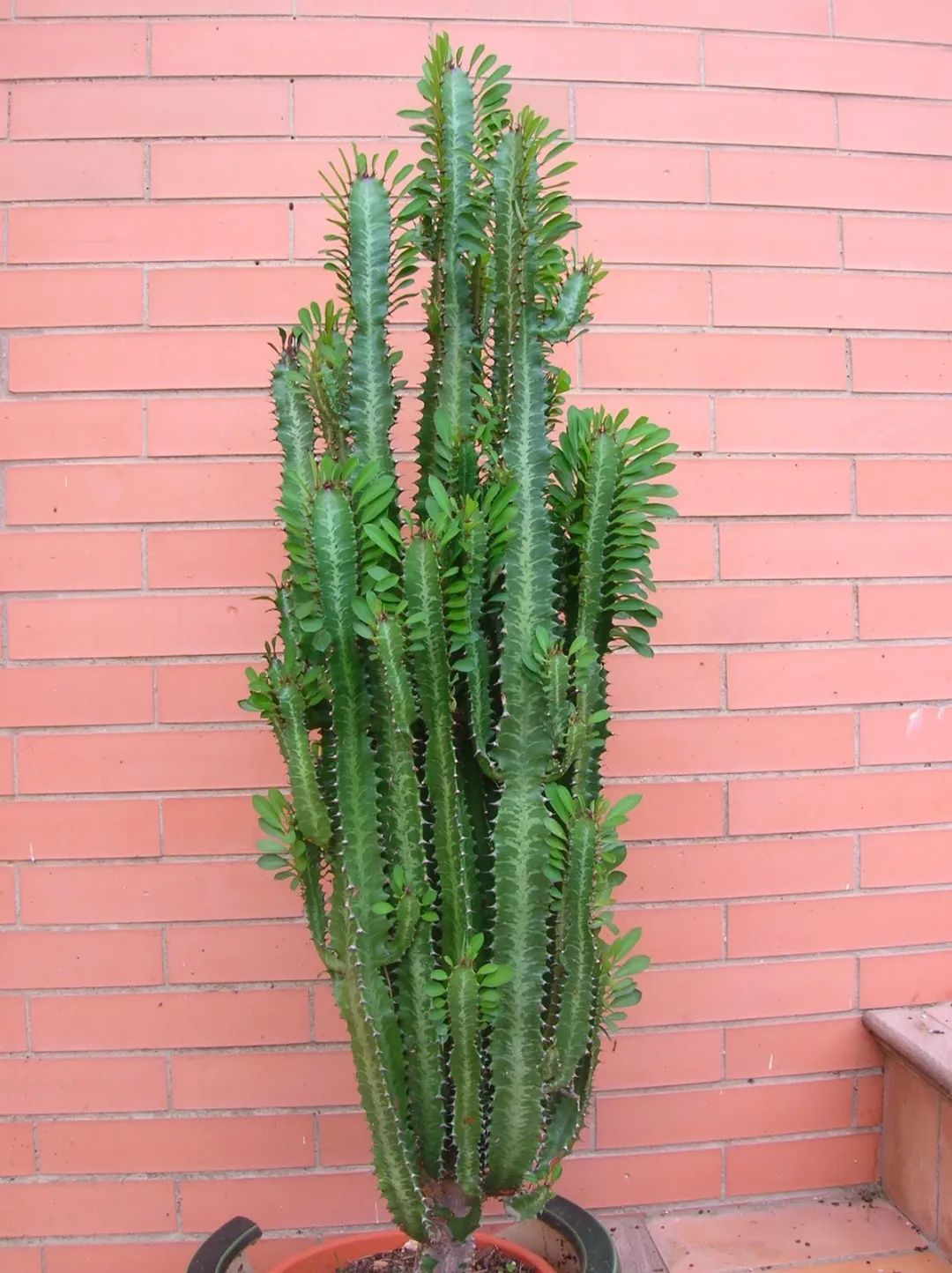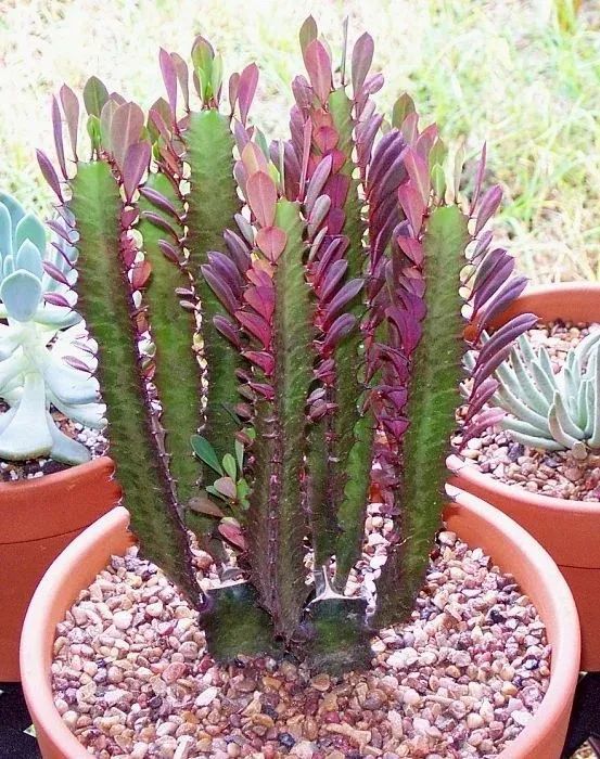 彩云阁就是我们平常所说的“龙骨”,也叫“三角霸王鞭”,它的植株可以长到两三米高,即便是养在室内,它是可以持续不断向上生长的,它的茎是三条棱,茎上面有一些小尖刺,偶尔也会有叶子,但在过度低温或长期干旱的时候,叶子会掉落(彩云阁也有锦化的品种)。
