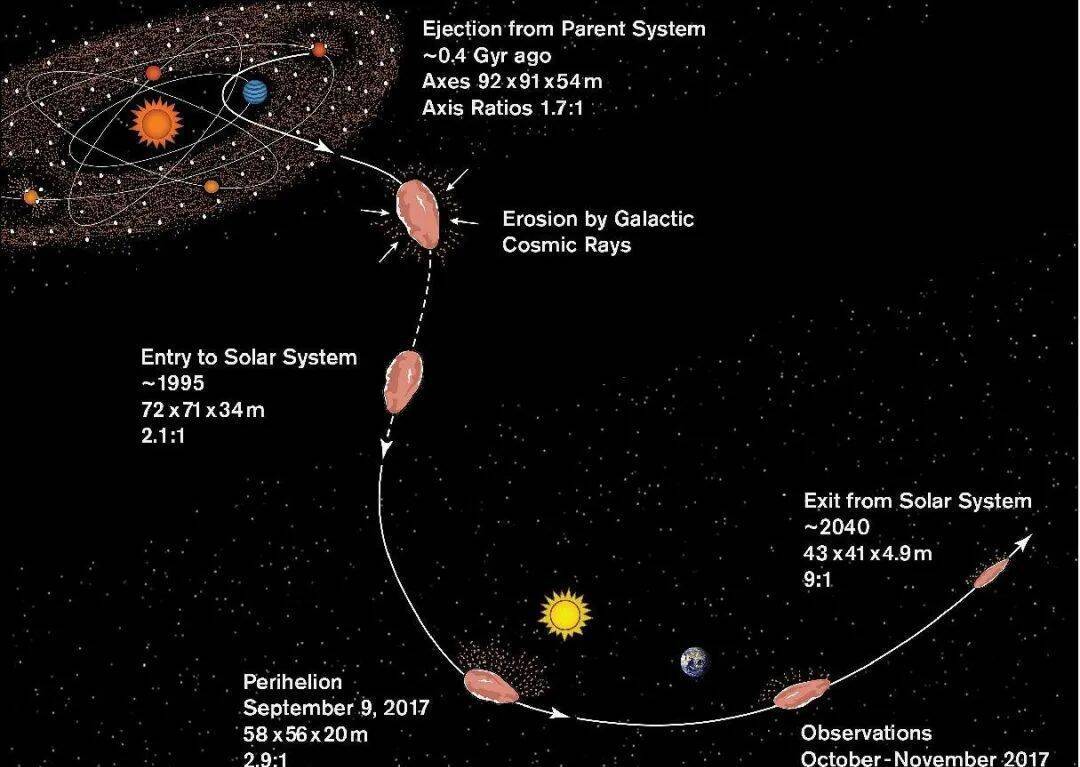 当这个扁平的歪歪扭扭的物体经过太阳时,它一头接一头地翻滚着,加速的速度无法用太阳的引力来解释。天文学家也找不到任何可见的推进剂证据,比如水蒸气或气体从物体中逸出以推动它前进。