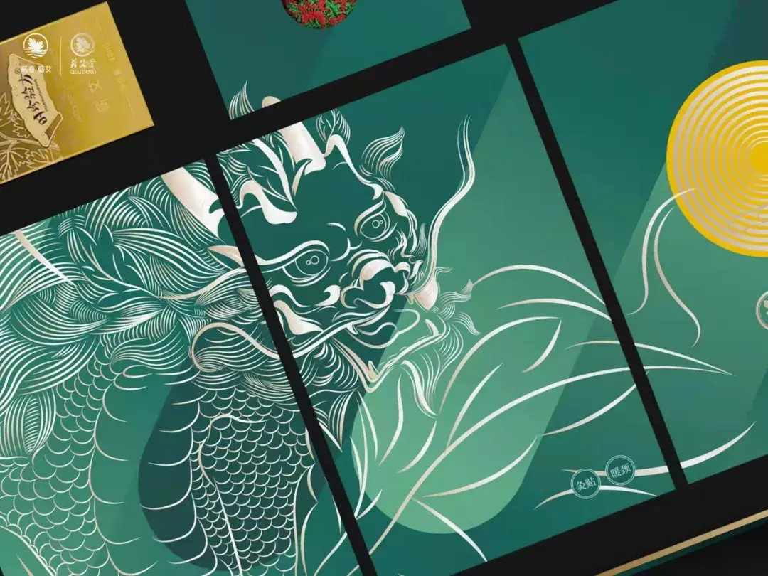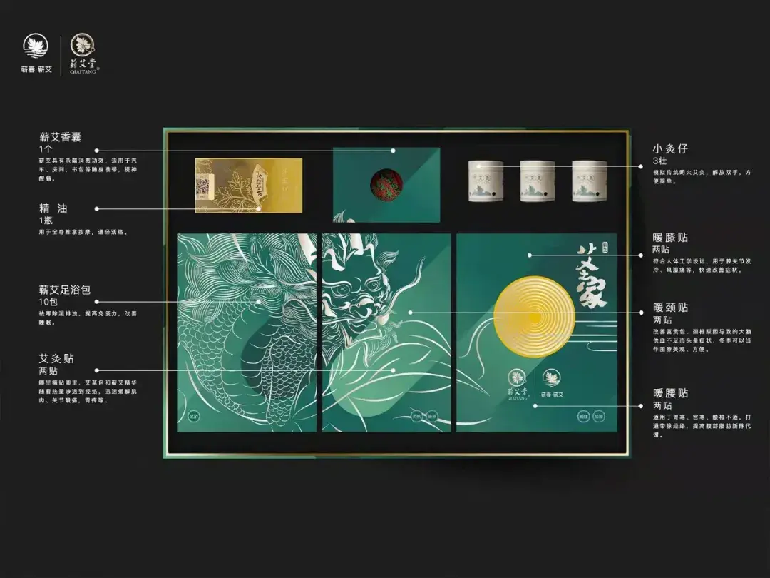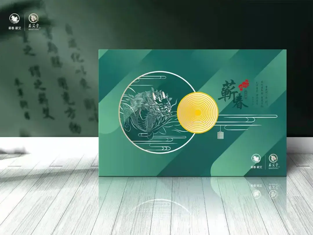 设计理念:金色麒麟“麒”艾而来,展现祥瑞之意;与明月交相辉映,寓意着蕲艾呵护下,人体将脉络通畅,恢复元气能量。整体以斜纹布局,象征生机活力和跃然动感;内附产品丰富,寓意:有“艾”之家,健康美满!