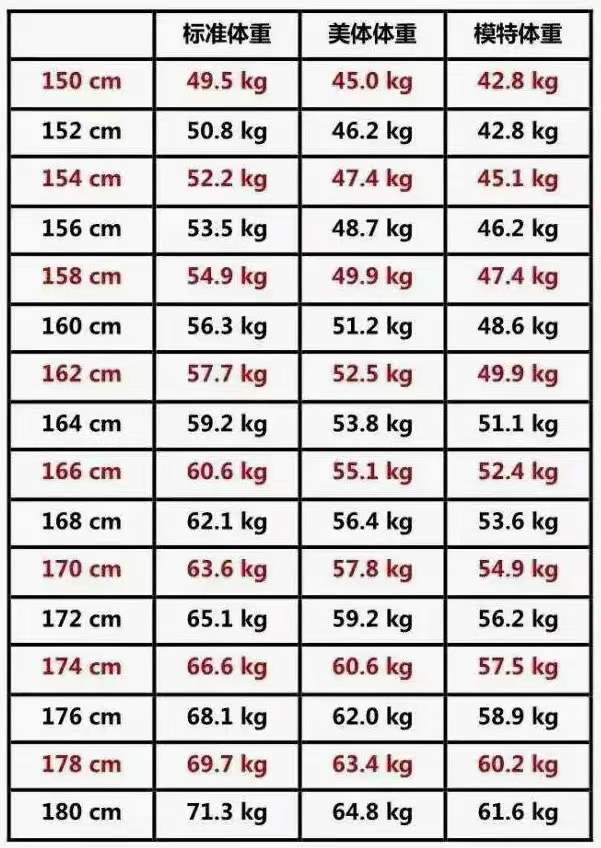 下面分享一张女性标准体重表给大家,大家可对号入座!