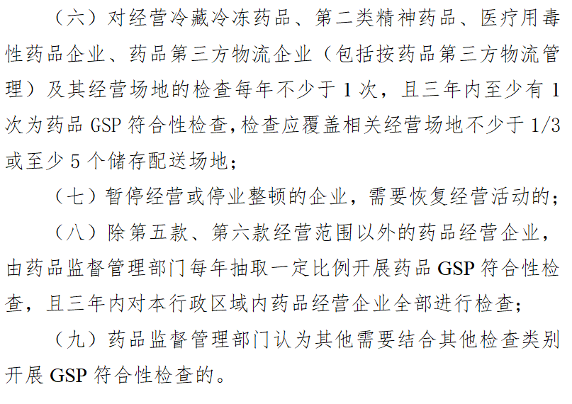 此外,药品监督管理部门每年抽取一定比例开展药品GSP符合性检查,且三年内对本行政区域内药品经营企业全部进行检查。具体法规如下: