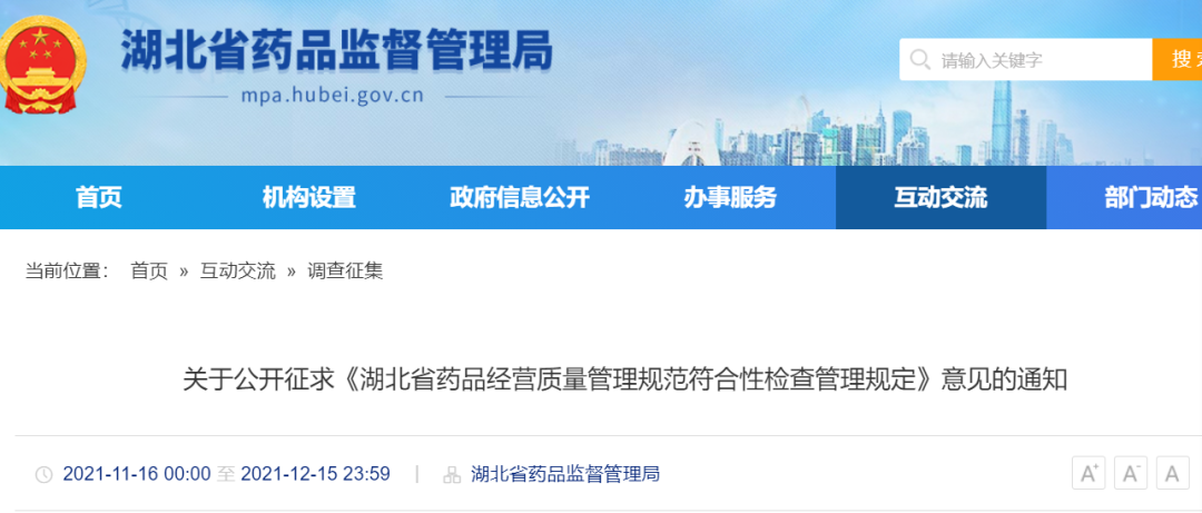 近日,湖北省药监局发布关于公开征求《湖北省药品经营质量管理规范符合性检查管理规定》意见的通知。